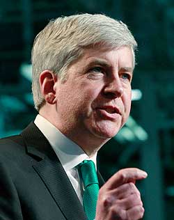 Gov. Snyder said he wants to change state liability laws to make it easier to give tours of auto factories and change perceptions of factory work.